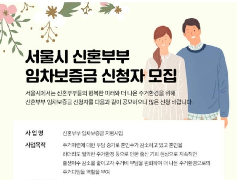 안녕하세요, 경제블로거 옙대디입니다. 오늘은 서울시 신혼부부 임대보증금 이자 지원사업에 대해 간략하게 정리해드리겠습니다. 서울시는 신혼부부의 주거비 부담을 덜어드리기 위해 시행 중인 ‘신혼부부’ 임대보증금 이자 지원사업의 혜택을 확대하고 있습니다. 이전보다 조건이 완화되어 더 많은 신혼부부가 혜택을 받을 것으로 보입니다. 높은 이자율과 전세가격 상승으로 주거비 부담이 커진 상황에서 실질적인 도움이 될 정책으로 보입니다. 그러면 서울시 신혼부부 임대보증금 이자 지원사업의 조건을 간략하게 정리해 보겠습니다. 서울시 신혼부부 임대보증금 이자 지원사업