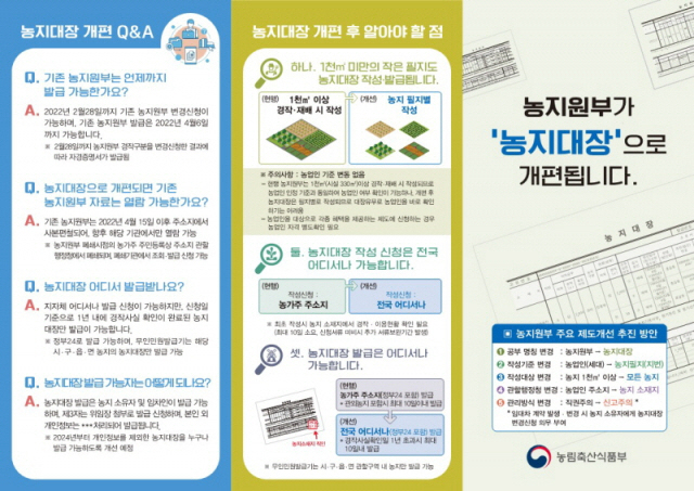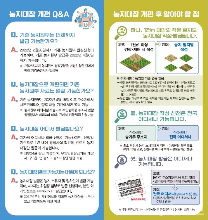 농업지원부는 지난 49년 동안 농지의 공적 원장 역할을 했으나, 향후 명칭은 농지법 개정에 따라 ‘농지관리인’으로 변경된다. 4월 15일까지 개정된 농장지원부서 정비 및 기존 원장 원본 발급을 완료하고 농장총괄원장으로의 전환을 추진할 예정이다.같은 방법으로 추첨하여 편찬본문도 무효화 확대하여 면적이 1,000제곱미터 이상인 경작지의 모든 임대차계약이 발생 또는 변경되며 경작지의 소유자는 변경 사유가 발생한 날부터 60일 이내에 경작지를 관할하는 행정청에