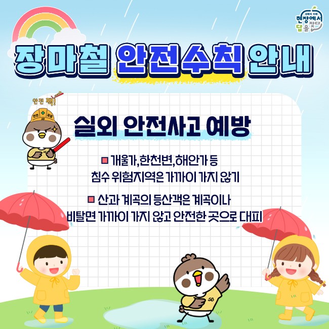 본격적인 장마철이 시작되었습니다. 갑작스러운 폭우로 인한 사고에 특히 주의해야 하는 계절입니다. 그래서 장마철 안전 수칙을 공유해드리겠습니다. 1. 매일 날씨를 확인하세요 – 날씨 예보와 기상 특보를 자주 확인하는 것이 좋습니다. – 긴급 재난 문자 메시지와 지역 방송에 주의하세요. 2. 주택 안전 점검을 실시하세요 – 지붕, 옥상, 외벽에 누수가 없는지 미리 점검해야 합니다. – 배수구와 배수관을 청소하여 원활한 배수를 보장하는 것이 좋습니다. – 창문과 문의 틈새를 확인하고 필요하면 보강하세요. 3. 홍수에 미리 대비하세요 – 지하실이나 저지대 주택은 배수 펌프를 준비하는 것이 좋습니다. – 중요한 물건은 높은 곳으로 옮기세요. – 콘센트는 물에 닿지 않도록 높은 곳에 설치하세요. 4. 야외 활동에 주의하세요 – 계곡, 강, 해변 등 물 근처에서의 활동을 자제하세요. – 산사태 위험 지역은 피하는 것이 좋습니다. – 외출 시에는 우산, 우비 등 우비를 준비하세요. 5. 차량 점검 – 와이퍼, 타이어 등 차량 상태를 미리 점검하세요. – 침수 위험이 있는 지역에는 주차하지 않는 것이 좋습니다. – 도로 주행 시에는 안전 속도를 준수하고 안전거리를 유지하세요. 6. 비상용품 준비 – 손전등, 라디오, 비상식량, 식수 등을 준비하세요. – 구급상자와 응급처치용품을 준비하는 것도 좋습니다. 7. 전기 시스템 점검 – 회로 차단기 작동을 확인하세요. – 침수 시 전기제품은 즉시 작동을 멈춰야 합니다. 8. 위생 관리 – 물에 잠긴 음식은 즉시 폐기하세요. – 침수 지역은 질병 예방을 위해 소독해야 합니다. 9. 미리 대피 준비 – 대피 경로와 대피소 위치를 미리 파악하세요. – 비상 시 신속히 대피할 준비를 하면 도움이 됩니다. 위의 9가지 안전 규칙을 잘 알고 실천한다면 우기에 재난으로부터 안전하게 지낼 수 있습니다. 항상 조심하고 대비하는 것이 중요합니다!