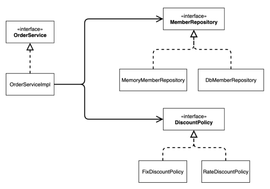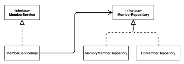 이 코드에서 MemberServiceImp는 MemberRepository 인터페이스와 그 구현인 MemoryMemberRepository에 의존합니다.