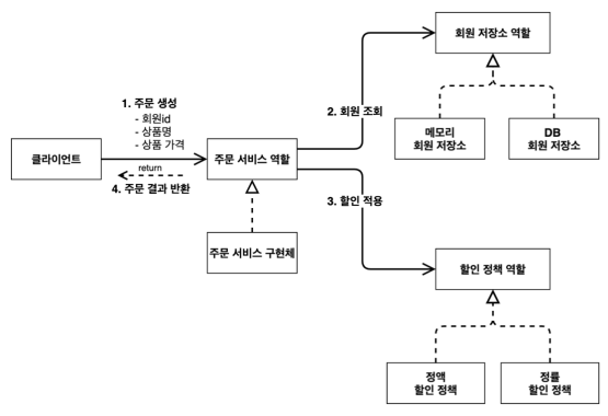 3. 할인 적용 : 주문 서비스는 회원 등급에 따라 할인 정책을 위임합니다.